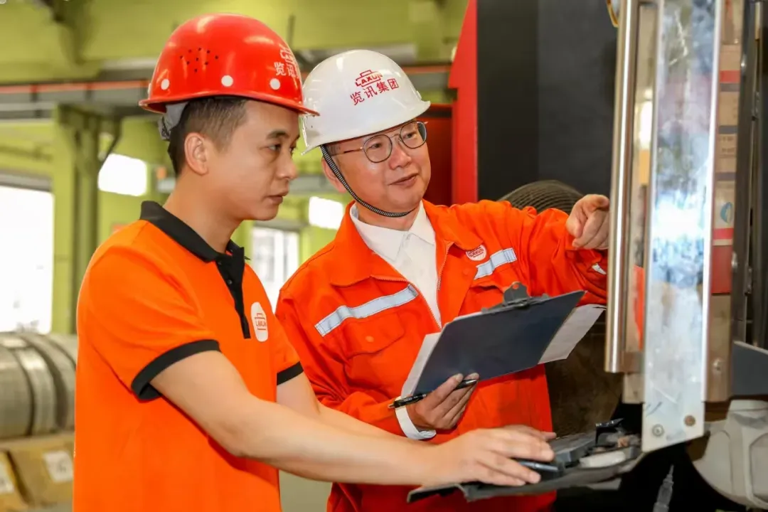 览讯科技总裁贺颂钧(右)在与员工交流。